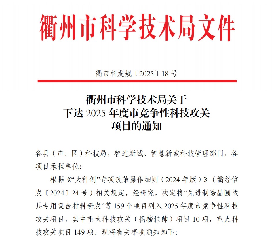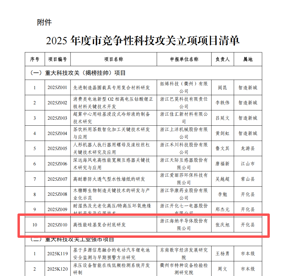 日前,衢州市科学技术局发布《衢州市科学技术局关于下达2025年度市竞争性科技攻关项目的通知》(衢市科发规〔2025〕18号),浙江海纳半导体股份有限公司(以下简称“海纳股份”)凭借“高性能硅基复合衬底研发”项目,成功入选2025年度衢州市重大科技攻关(揭榜挂帅)项目,标志着海纳股份在半导体衬底材料领域的技术创新能力、产业化潜力获得市级主管部门的权威认可。